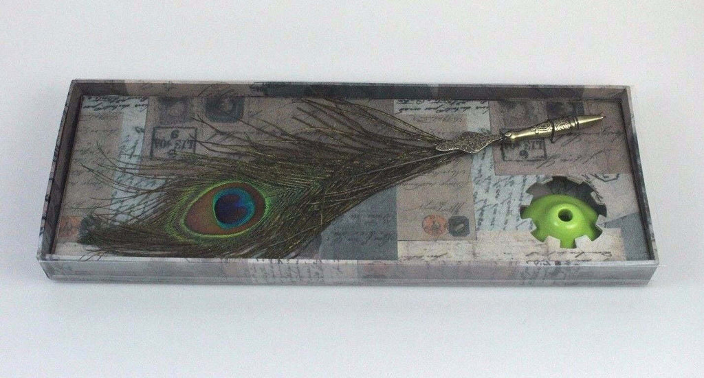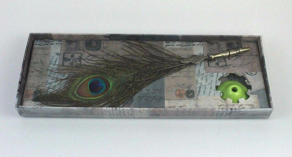 This beautiful quill ballpoint pen set is the perfect way to add a little Old World sophistication to your desk.  Featuring a real peacock feather that has been adorned with an antique silver ballpoint grip section this pen gives you the charm of using a real quill pen but with the convenience of a ballpoint.  Complete with a glazed ceramic pen stand this set makes a great gift.