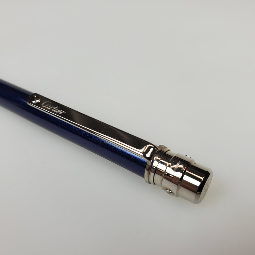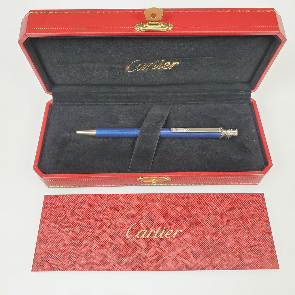 This auction is for a BRAND NEW Cartier Santos ballpoint pen. This pen features a blue lacquer body and is adorned in a high-gloss palladium trim. This twist-action ballpoint pen not only looks amazing but it feels even more luxurious when placed in your hand. This pen is a great size/weight for ladies and gentleman alike.