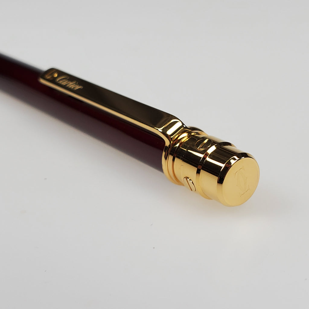 This listing is for a BRAND NEW Cartier Santos ballpoint pen. This pen features a burgundy lacquer body and is adorned in a high-gloss gold trim which showcases the iconic Cartier Santos design around the crown of the pen. This twist-action ballpoint pen not only looks amazing but it feels even more luxurious when placed in your hand. This pen is a great size/weight for ladies and gentleman alike.