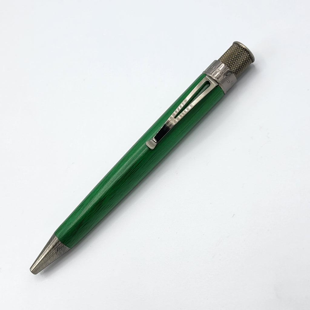 One-of-a-kind listing (literally). This Retro 51 "artist proof" features a green, painted Bamboo body with antique silver trim. This pen was being considered as a retailer exclusive but did not make it into final production. As such, there were only 2-3 Tornado pens that were produced in this finish/color.